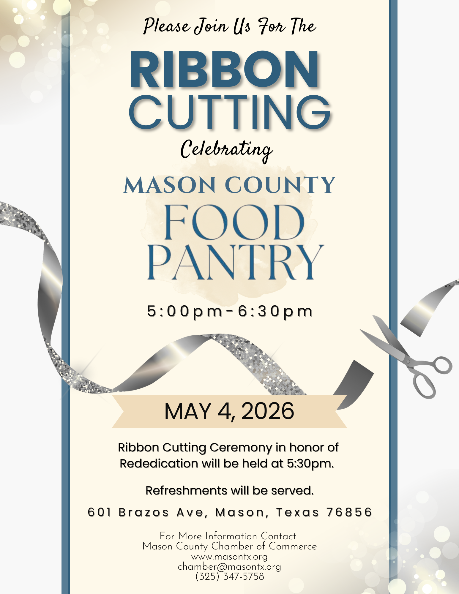 You're invited to a Rededication and open house at the Mason County Food Pantry. Come and see the changes we are making and how we are serving our community! Refreshments will be served.
